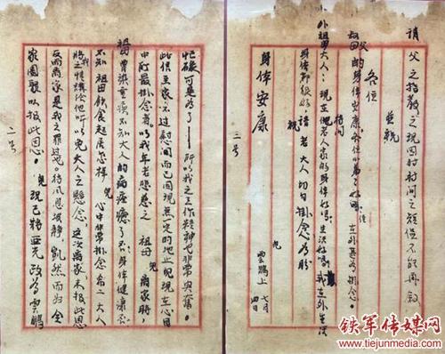 父母亲大人:儿久未写信回来,因为学习的时间太忙,所以未抽闲将儿一切的情形告诉大人,儿1934 年参加军队未曾叩见过大人,不知大人容形及玉体如何?殊为可宪。